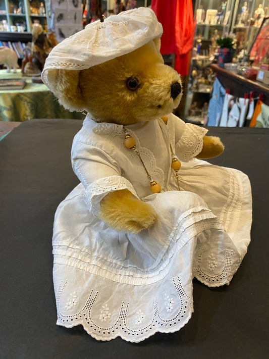 Vintage Merrythought Teddy Bear fully articulated in white dress